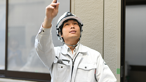 現場が動き出すと、現場の見回りに行きます。現場作業における技術的指導、きちんとした作業手順を踏んで施工できているかを確認します。スタッフの安全管理は一番重要です。危険な状態で作業をしている人にはその場でなぜ危険なのかを説明し、危険な箇所を発見した場合は、その場で改善し、報告します。